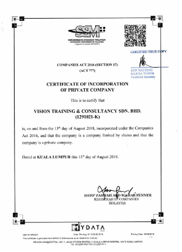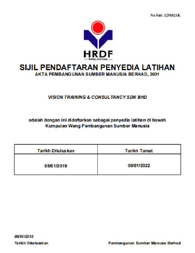 Vision Training & Consultancy Sdn Bhd is a Registered HRDC Training Provider and was Established on 13th August 2018 by its Founder Ts Karuna (Shan) to provide Various Technical, Non-Technical & Certification Based Trainings for Employees within the Industrial & Service Sector.