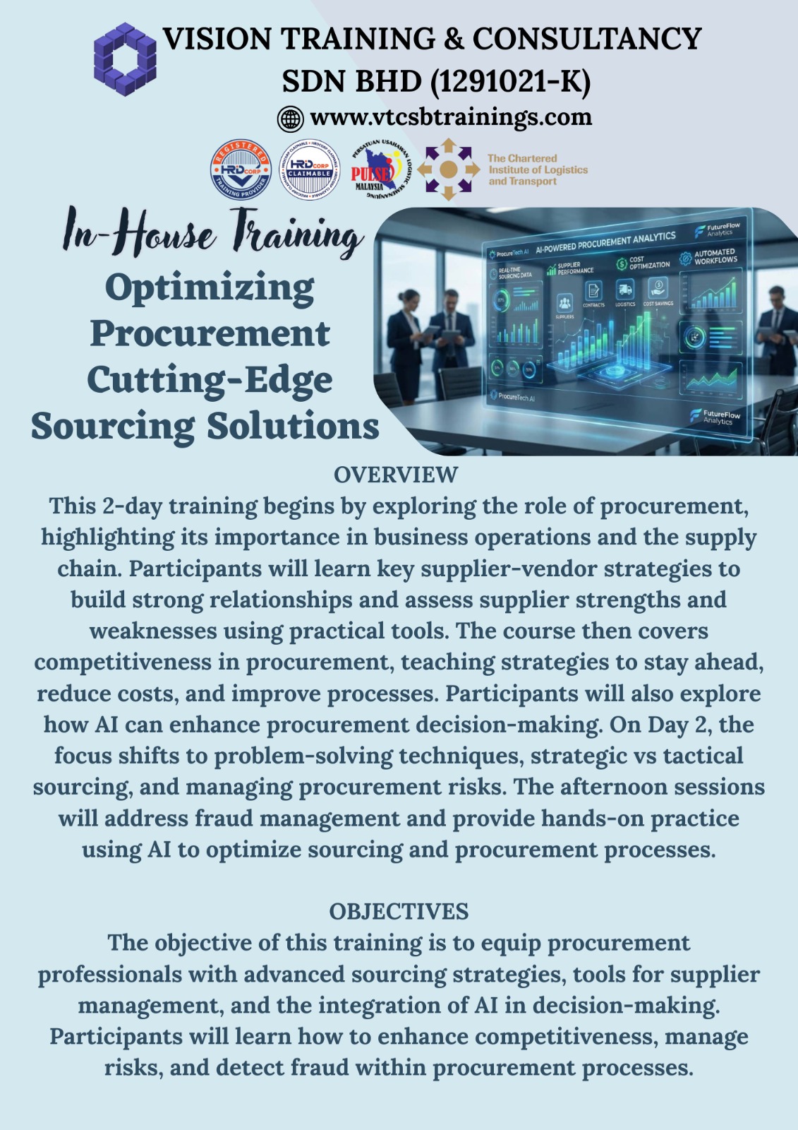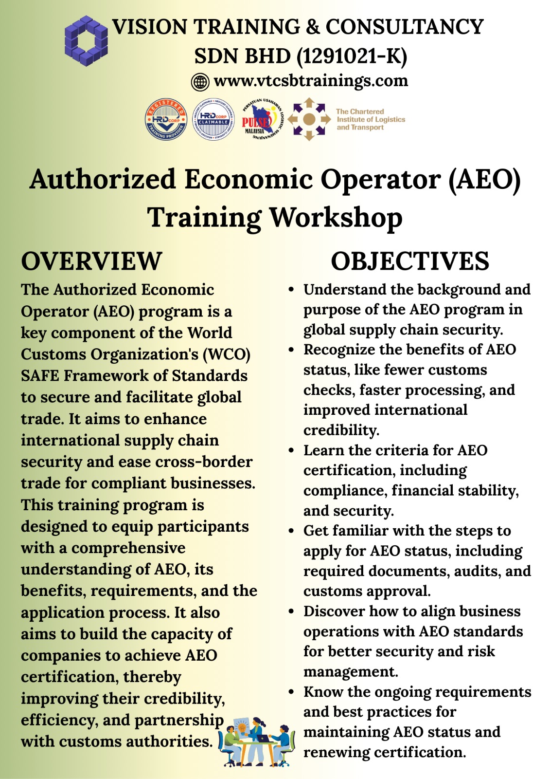 Vision Training & Consultancy Sdn Bhd is a Registered HRDC Training Provider and was established on 13th August 2018 to provide Various Technical, Non-Technical, Coaching, Consultancy & Certification Based Trainings for Employees within the Industrial & Service Sector.