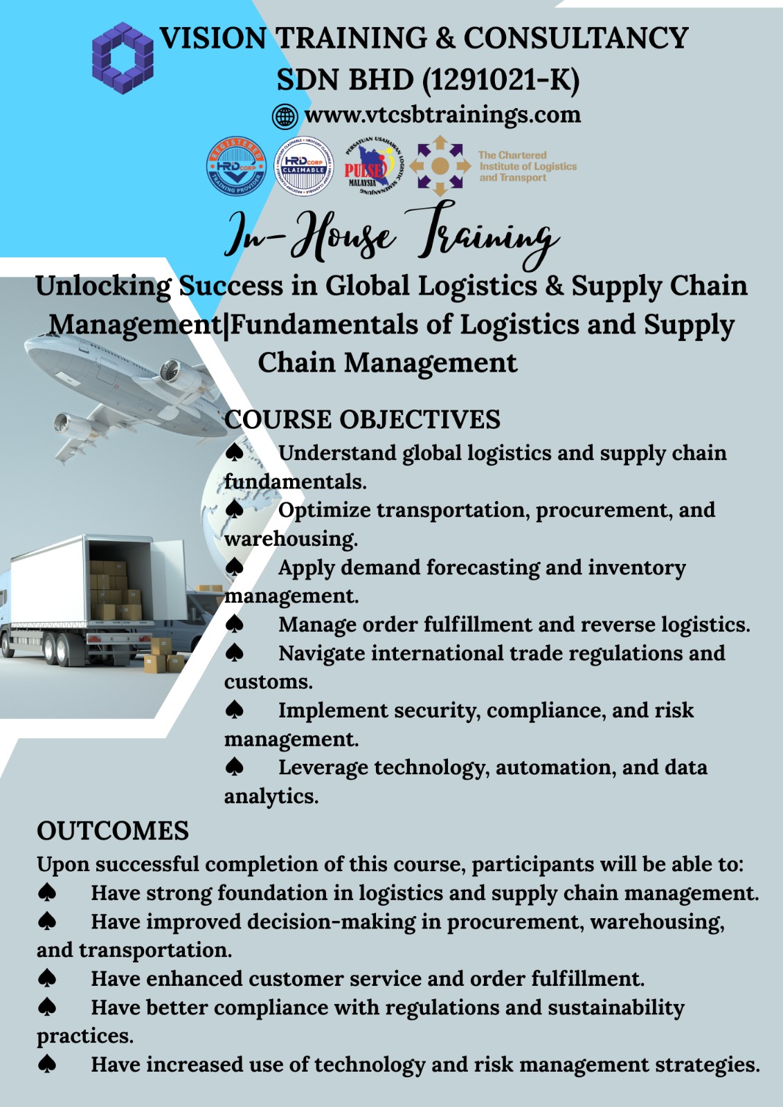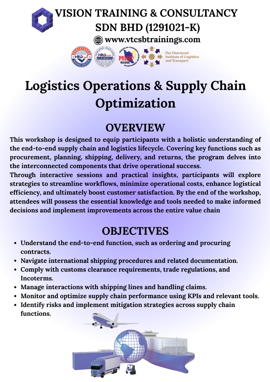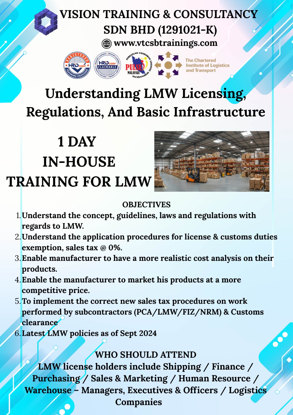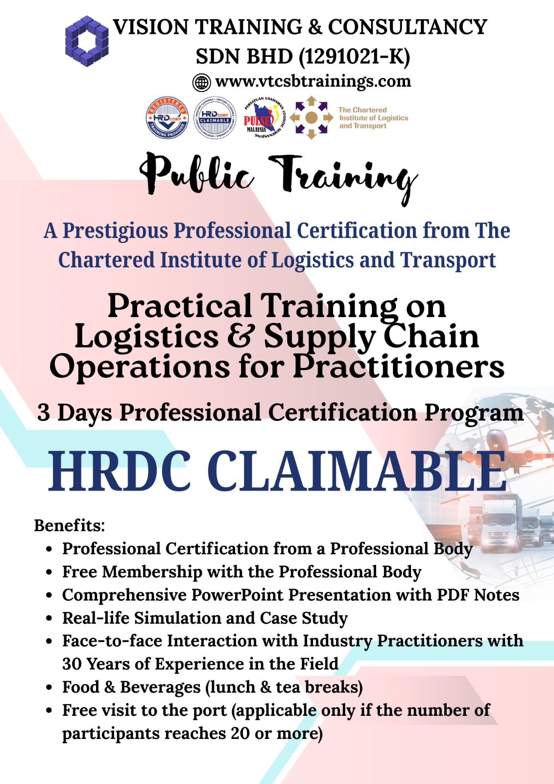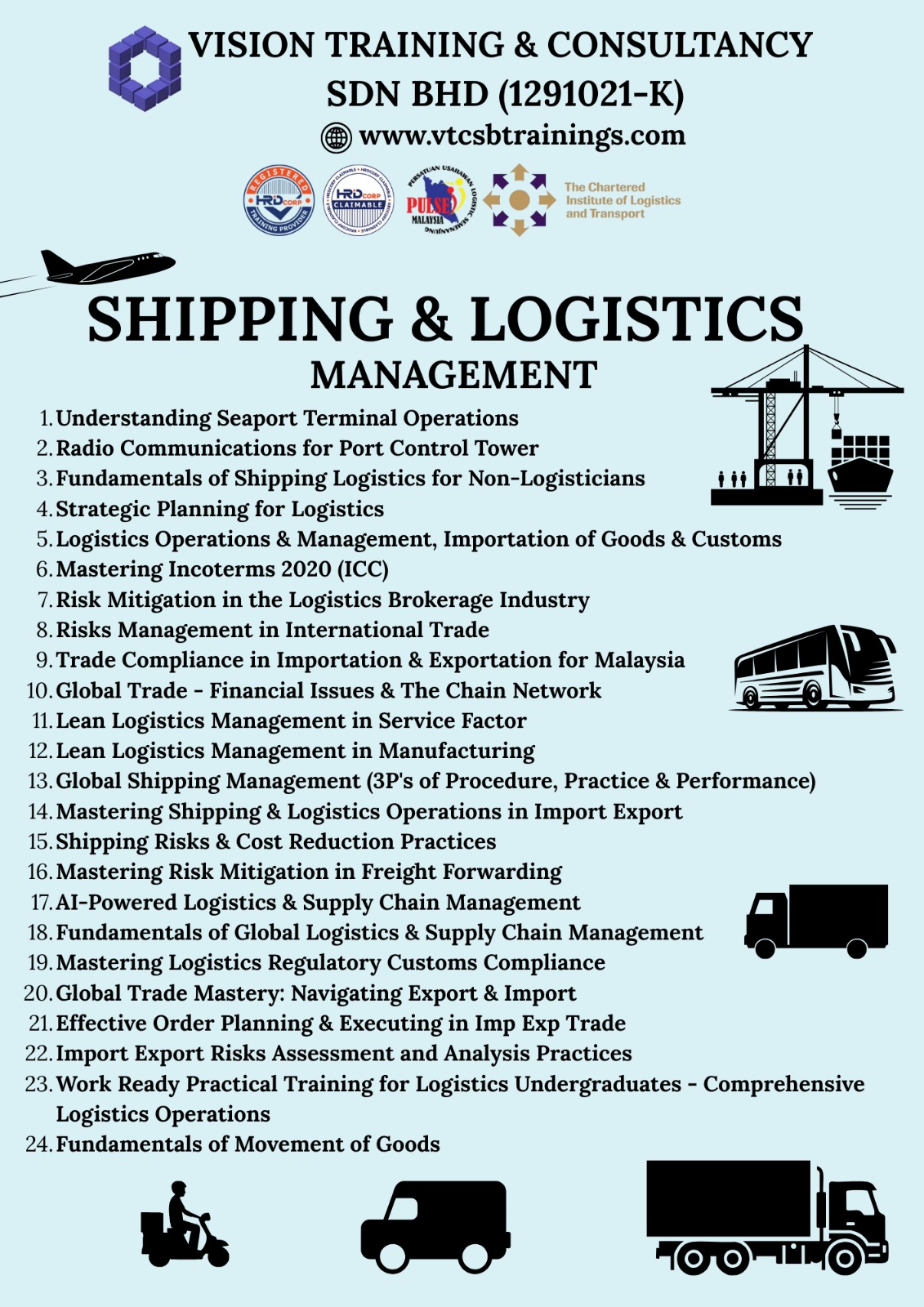 A Member of TPAM (Training Providers Association of Malaysia), Corporate Affiliate Member of CILTM (The Chartered Institute of Logistics & Transport Malaysia) & Exclusive Member of PULSE (Persatuan Usahawan Logistik Semenanjung Malaysia)